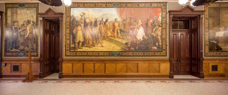 The paintings “reflect the attitudes of the time and were intended as a didactic presentation, responding to cultural challenges for the school’s largely immigrant, Catholic population,” he explained. “In recent years, however, many have come to see the murals as at best blind to the consequences of Columbus’ voyage for the indigenous peoples who inhabited this ‘new’ world and at worst demeaning toward them.”