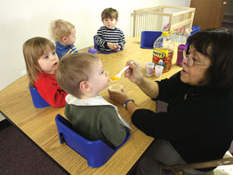And the Children’s Center has ample space; two classrooms have been converted into a large indoor play space. Another large classroom has become a “messy” room with sand and water tables. Other spaces have been transformed into nap rooms, a library and infant and toddler care areas.