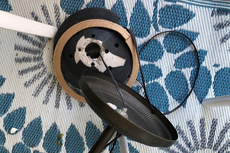 As I turned the switch, the lamp started falling over onto my arm. I caught it and realized there were bits and pieces of the base spread all over the floor.