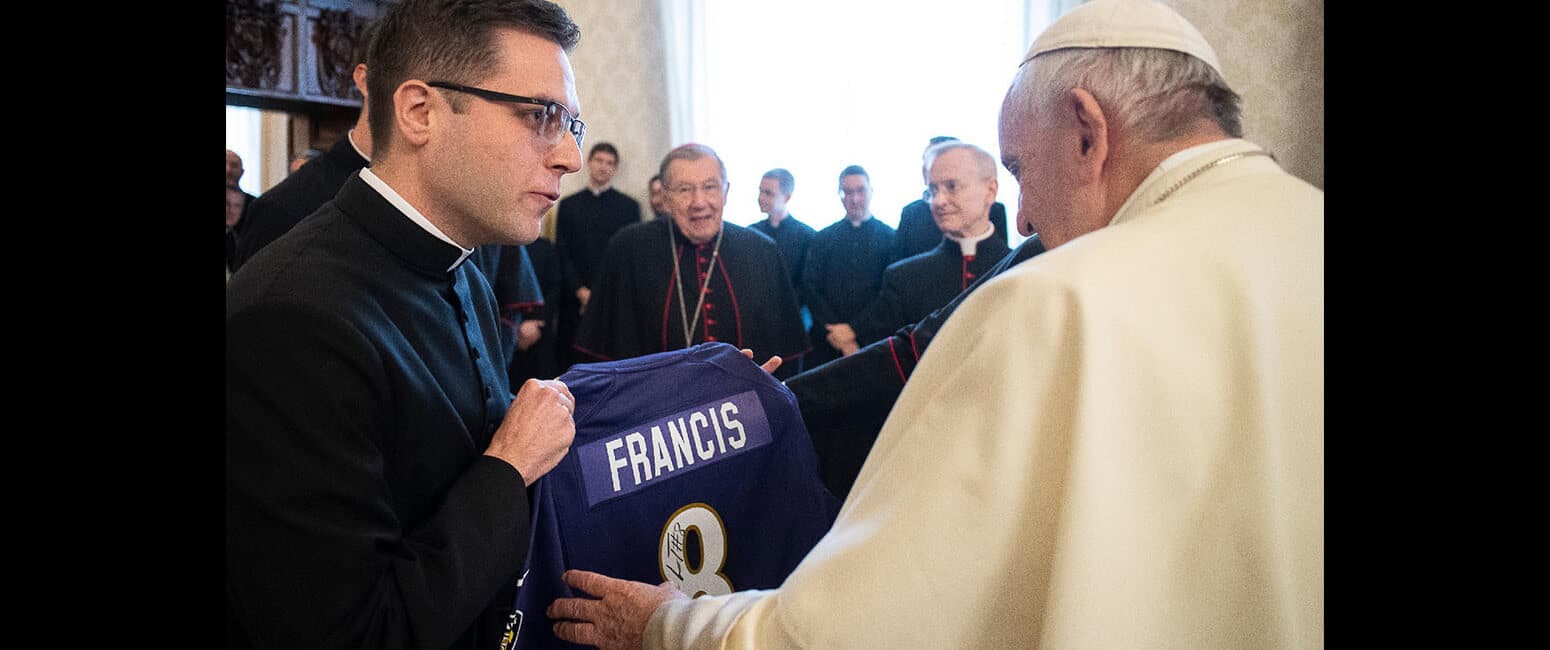 A delegation from the Archdiocese of Baltimore presented Pope Francis with a custom-made Ravens jersey signed by Coach John Harbaugh, a Catholic, and quarterback Lamar Jackson during a Dec. 3 audience at the Vatican. They also gave the Holy Father a “spiritual bouquet,” a book produced by the Archdiocese of Baltimore that contains prayers and greetings from people across the archdiocese in celebration of the pope’s upcoming 50th anniversary of his priestly ordination.