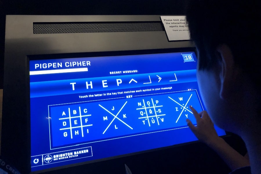 The boys loved stealthily crawling through ductwork and looking for secret codes with magnifying glasses. I enjoyed seeing the spy disguises and watching the video aspects of the exhibits.