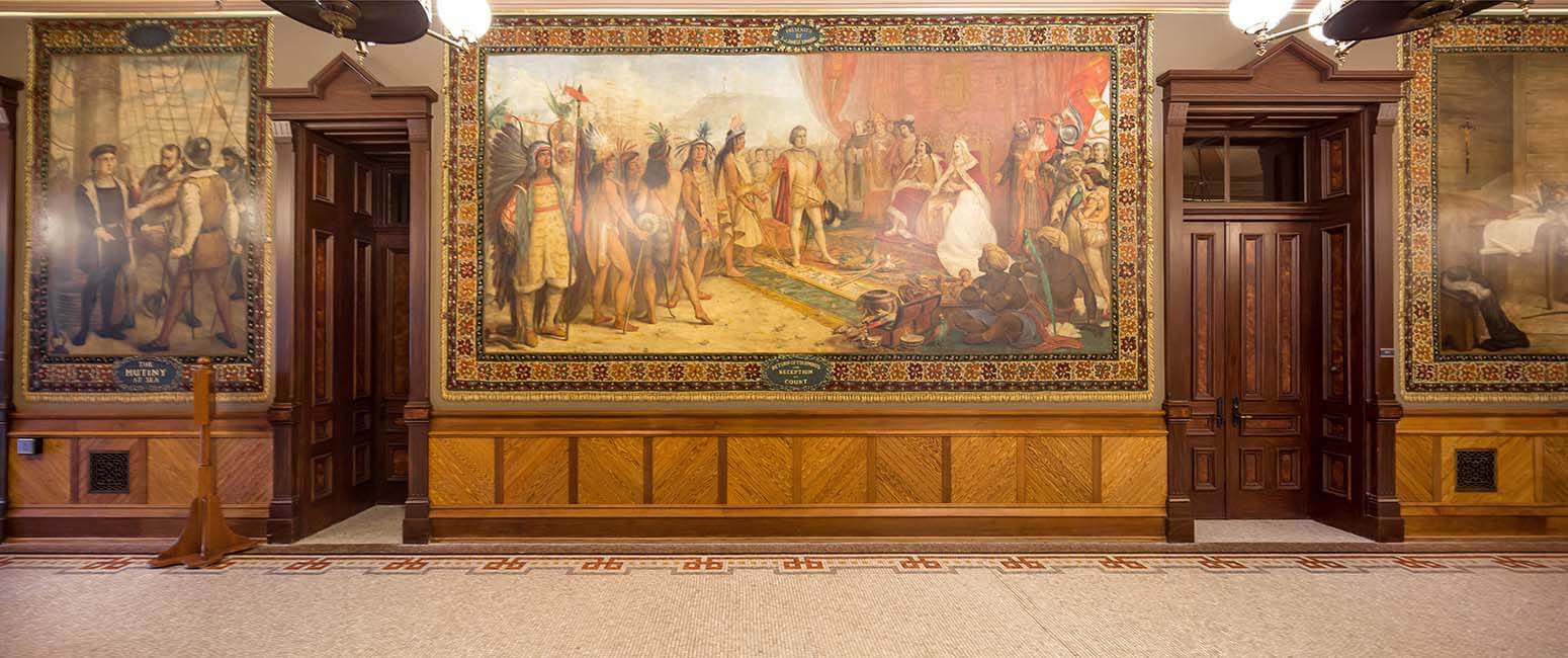 The president of the University of Notre Dame in South Bend announced that in consultation with other school officials, he has decided to cover 19th-century murals in a prominent campus building that depict the life and exploration of Christopher Columbus.