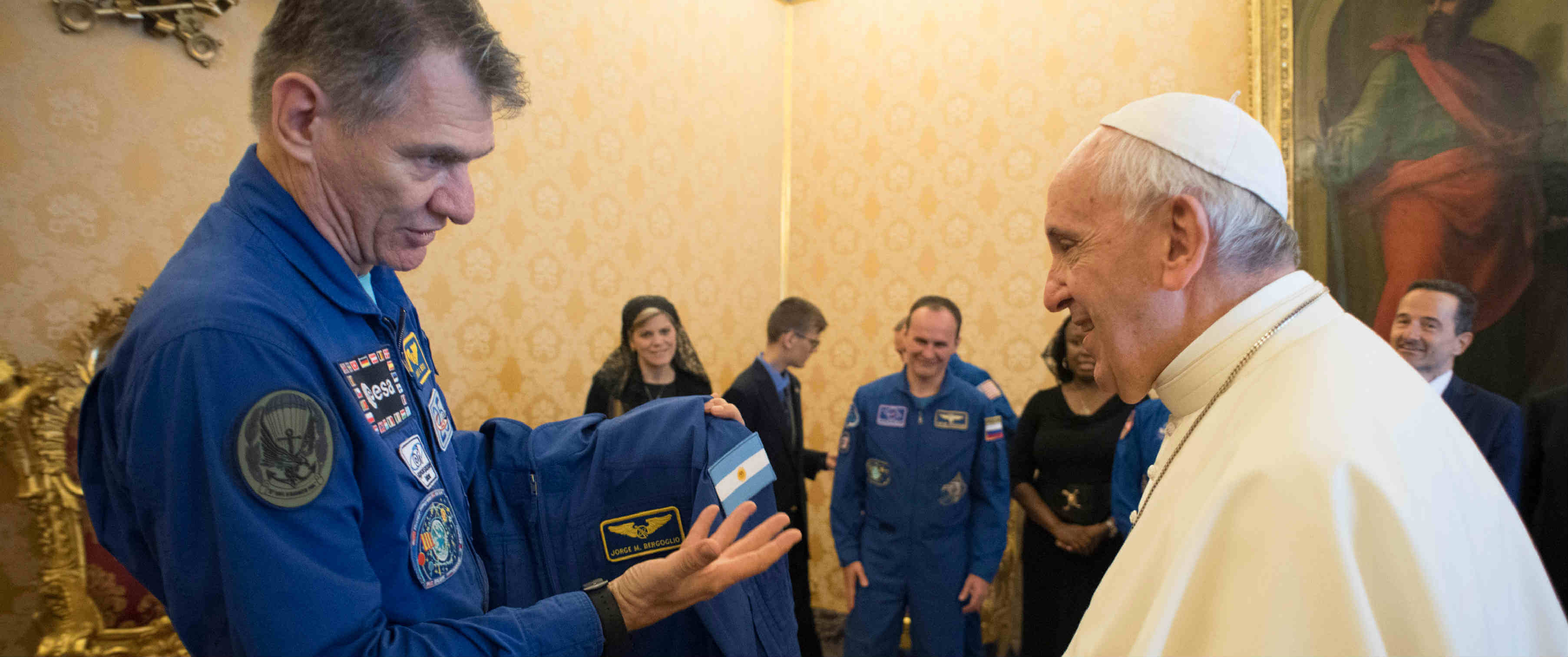 If Pope Francis ever plans an apostolic trip to space, he’s all set after receiving a custom-made blue flight suit with patches of the Argentine flag, his papal coat of arms and a pair of angel wings with his crew name, Jorge M. Bergoglio.