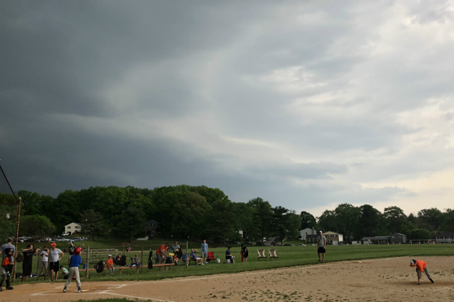 The other night we thought our little league game might be rained out, but we managed to get a few innings in before the coaches called it a night. The sky was getting really dark when our 8-year-old stepped onto the mound to start pitching.