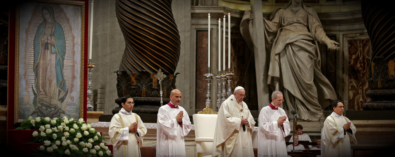 Processing into the basilica dressed in white, the symbol of purity, Pope Francis made his way to a replica of St. Juan Diego’s tilma, which bears the image of Mary, who appeared to the indigenous saint in 1531.