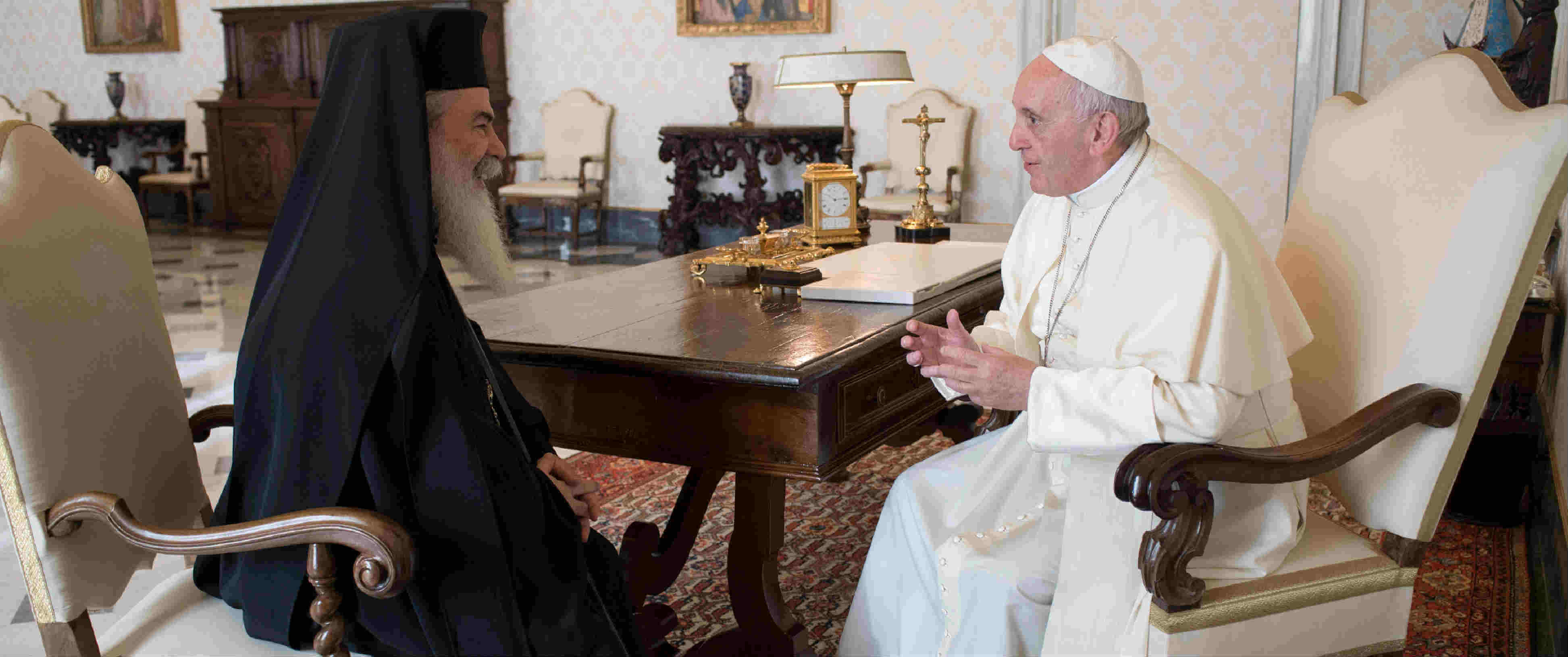 As minorities living in a troubled land, Christians in the Holy Land must forgive each other for past mistakes and work together for the future of their communities, Pope Francis told the Greek Orthodox patriarch of Jerusalem.