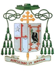 Impaled arms. Dexter: Quarterly azure and argent, a cross botonny thoughout of the second and gules, in dexter chief a star of the second (Archdiocese of Baltimore). Sinister: Argent, within a double tressure flory counterflory of seven gules, an eagle rising, wings elevated and addorsed sable, holding in the beak an olive branch vert. Archbishop of Baltimore. Motto: Auscultabo ut Serviam.