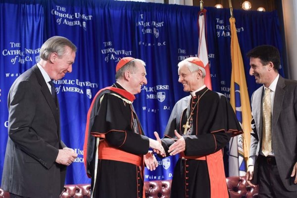 Cardinal Donald W. Wuerl of Washington, Catholic University’s chancellor, offered an invocation and then introduced Cardinal Parolin. He noted the prelate is known as an expert in Mideast affairs who was responsible for efforts bringing Israelis and Palestinians together for peace talks. In Asia, Cardinal Parolin also was instrumental in efforts to build up ties between the Vatican and Vietnam, Cardinal Wuerl said.