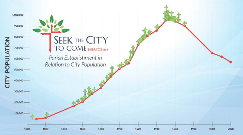 Actualmente, la población de la ciudad es de menos de 570.000 personas. Así como las autoridades públicas han lidiado con una infraestructura descomunal con demasiadas estructuras (escuelas, estaciones de bomberos, etc.), la Arquidiócesis también enfrenta un reto semejante.