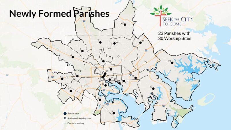 Después de casi dos años de involucrar activamente a 6,000 personas en un camino de escucha, visión y discernimiento en oración, la iniciativa Busquemos la ciudad venidera de la Arquidiócesis de Baltimore ofrece su plan final para reimaginar y realinear a la Iglesia de la ciudad de Baltimore para llevar adelante su Misión Eucarística. Las 61 parroquias existentes se fusionarán en 30 sitios de culto y ministerio en la ciudad de Baltimore y en algunos de los suburbios vecinos. A continuación, detallamos los pormenores sobre las fusiones parroquiales.