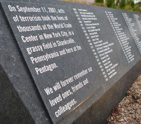 Part of the stone from the Pentagon’s damaged limestone walls is incorporated in a border at the entrance of the memorial with the inscription “September 11, 2001 9:37 a.m.” – marking the exact time the hijacked plane crashed, almost an hour after the first plane hit New York’s World Trade Center and about 20 minutes before the plane crashed in Shanksville.