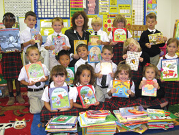 Seventeen kindergarteners in Lisa Macchia’s class at Woodmont Academy, Cooksville, shared their love of reading with underprivileged children in Baltimore by donating nearly 150 new and gently used books to the Begin With A Book campaign. Students chose the book drive as a project to live out their Kids 4 Jesus virtue of the month – giving.