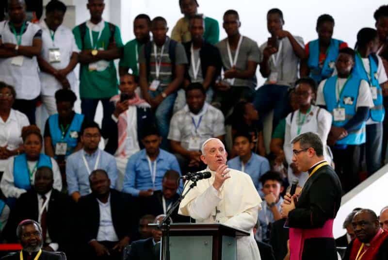 The themes of peace, reconciliation and care for creation took center stage again at the pope’s next event: an interreligious meeting with about 4,000 young people from Mozambique.