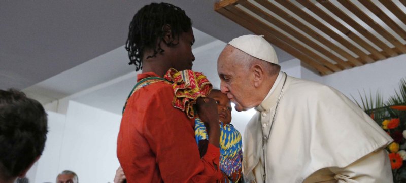 Wearing a headwrap and a skirt made of blue fabric with the pope’s image, she told Catholic News Service that the pope “can help stop the violence, first of all because he unites people. His words about reconciliation are very important for our people.”