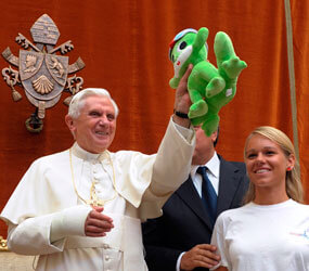 The pontiff posed for photos and donned the official cap of the swimming championships, which were being held in Rome. He accepted a German athletic jersey from German swimmer Paul Biedermann, who defeated American Michael Phelps in the 200-meter freestyle event, setting a new world record.