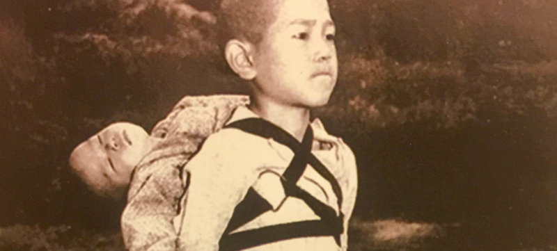 The photo shows a young boy, about 10 years old, carrying his dead little brother on his back. The boy is taking his brother to be cremated.