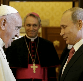 Pope Francis gave Putin a medallion of the “‘Angel of Peace,’ who,” he said, “defeats all wars and speaks of solidarity among peoples.”