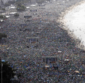 By the vigil the night of July 27, some pilgrims had found a way to avoid the lines. Almost in front of the Copacabana Palace, one of Rio’s most famous hotels, someone had dug a hole in the sand and placed a sheet of plastic around it, so that pilgrims could use it.