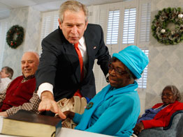 WASHINGTON – In a flurry of nervous anticipation, the Little Sisters of the Poor in Washington scrambled to finish last minute tasks and escort elderly residents to their seats as they prepared for a Christmas visit by President George W. Bush and first lady Laura Bush Dec. 18.
