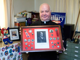 The priest is a member of the American Political Items Collectors, and goes to trade shows and conventions when he can.