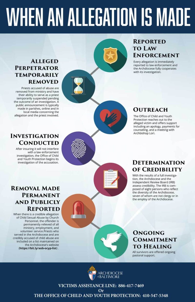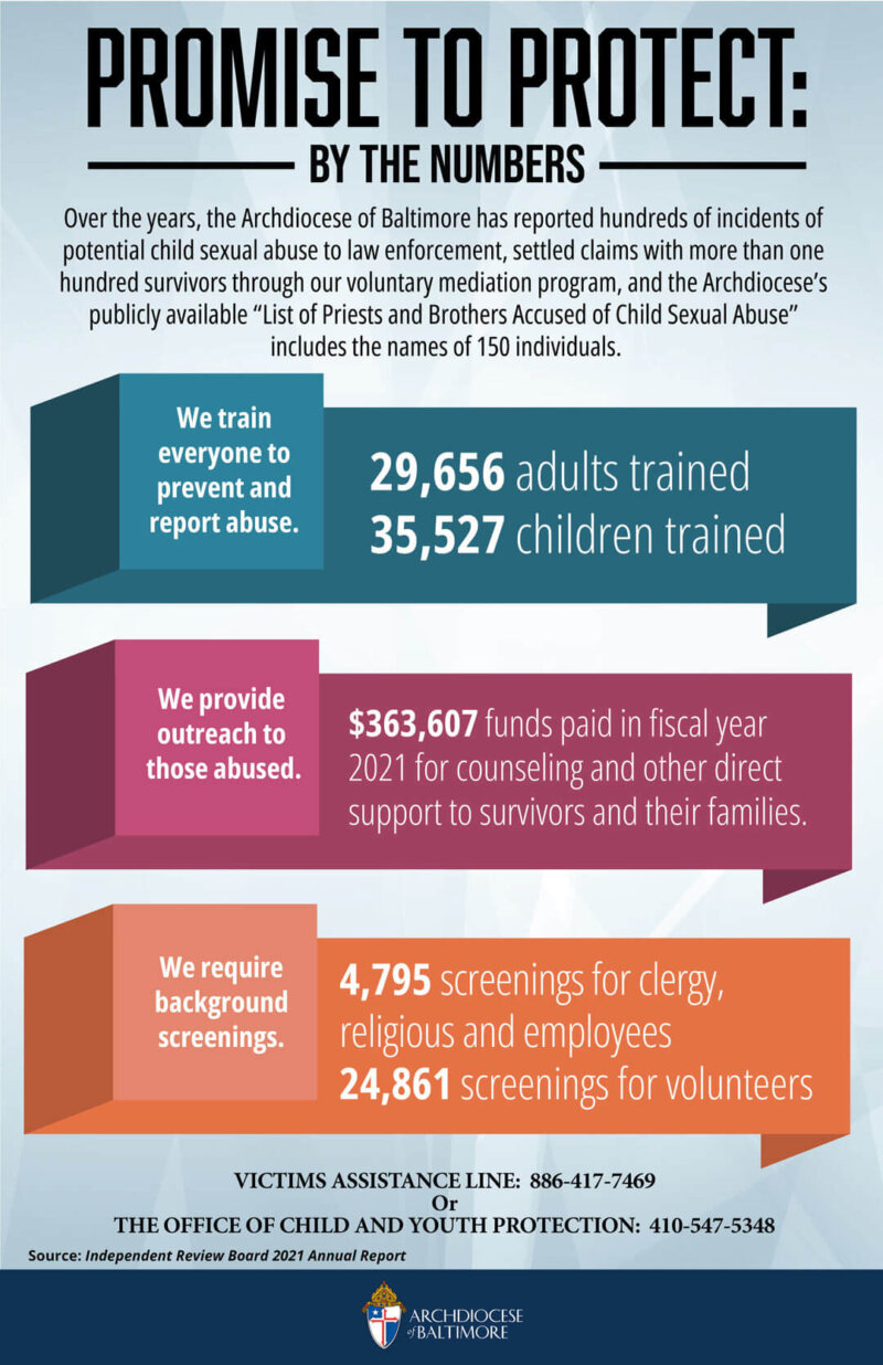 The Archdiocese of Baltimore is committed to protecting children and helping to heal victims of abuse. We urge anyone who has any knowledge of any child sexual abuse to come forward and report it immediately to law enforcement. If clergy or other church personnel is suspected of committing the abuse, we ask that you also call the