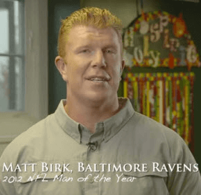 A Harvard graduate and veteran center, Birk was named the 2012 NFL Man of the Year. Since moving to Baltimore, the married father of six has participated in the annual Maryland March for Life.