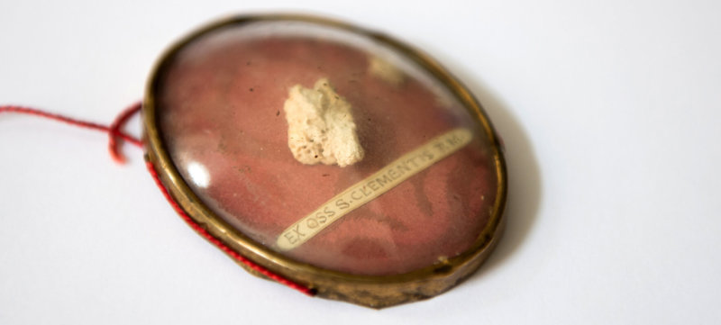 The relic sits on red silk damask within a small oval metal reliquary above the words “Ex Oss S. Clementis PM.”