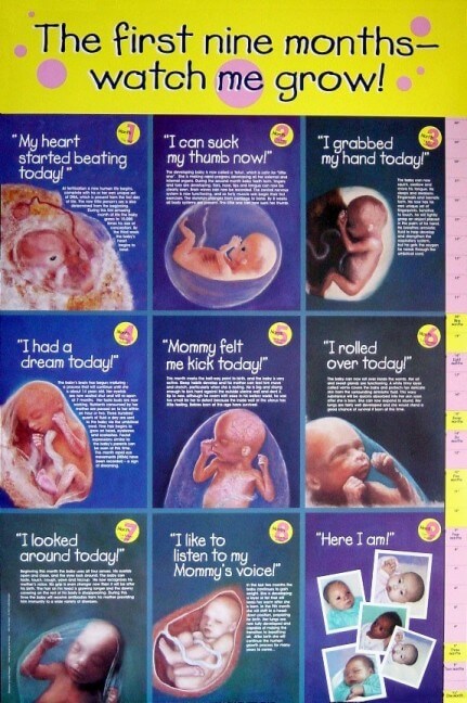 This beautifully illustrated collection of ten 16″ x 20″ full color posters chronicles the growth stages of a baby for nine months in the womb. Display them individually, rotating on a monthly basis, display the entire set. Also available in a space saving 24″ x 36″ all-in-one poster. They were designed for use with the Spiritual Adoption Program, but are also adaptable for any educational use such as schools, hospitals, doctor’s offices, pregnancy centers, fairs, etc. More ideas on using the posters. Also available in a handy brochure.