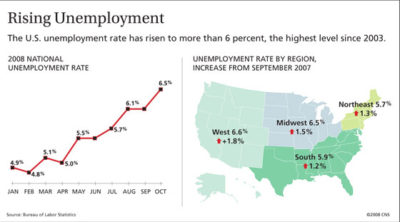 According to the U.S. Labor Department statistics released Nov. 7, the jobless rate rose to 6.5 percent in October when employers fired 240,000 workers. That figure put the total number of unemployed Americans past 10.08 million, the highest level in 25 years.