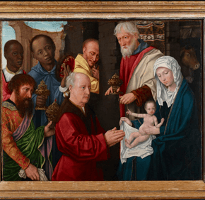 The Flemish “Adoration of the Kings” – near the exhibit’s entrance – was painted around 1500, and depicts one of the kings as African, although nothing in Scripture describes the magi’s origin beyond “being from the East.” An African king, who, in this oil painting, meets the onlooker’s gaze, and suggests “the universality of Christ’s message,” Spicer said.