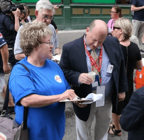 Most people were happy to take the lemonade and talk with Sister Julie Ann, a member of the Congregation of the Sisters of St. Agnes in Fond du Lac, Wisconsin, and more than a dozen other women religious who were part of the fifth Nuns on the Bus tour.