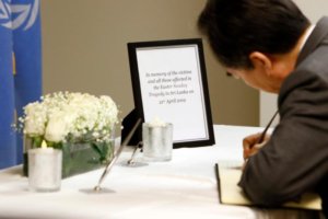 Many attendees shared expressions of sympathy by writing personal entries in the mission’s book of condolence, which was opened April 23. That day was designated by the Sri Lankan government as a national day of mourning. To date over 200 people have signed the book at the mission.