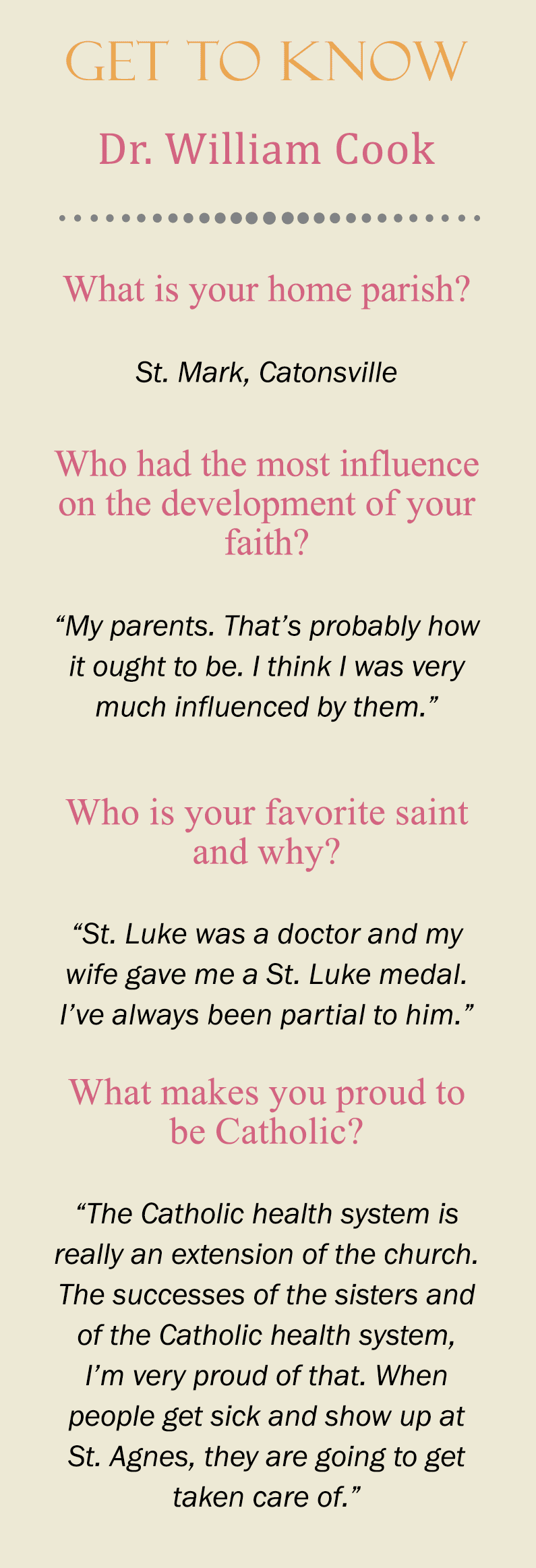 Cook is a lifelong resident of Catonsville, now practicing medicine and running meetings “just a few football fields” from where he grew up. He is also a lifelong Catholic. He fondly remembers growing up in St. Mark in Catonsville – the parish he was baptized in and once served on the board for. Just recently, his first granddaughter was baptized in the parish.