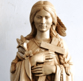 Blessed Kateri, of Algonquin and Mohawk descent, was born in 1656. She was orphaned as a child and raised by her uncle, chief of the Mohawk village. A smallpox epidemic impaired her eyesight and scarred her face. Despite her family’s anger, she was drawn to the faith and went to Montreal, where she practiced her faith.