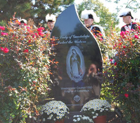 The entire garden is encircled by a rosary and cross laid out in stone. Several benches have been placed for meditation with accent lighting provided and placed by Jim Kramer. The dedication was performed by Monsignor James Farmer, pastor, and Father Gerard Steffener with the James Cardinal Gibbons Assembly providing color corps honors.