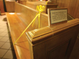 The reserved seats are located on the left side of the church toward the back. A plaque with the name of the parishioner marks the space in the pew, which is also draped with a yellow ribbon. The plaque states that the space will be reserved until the parishioner returns home safely.