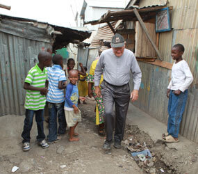 At age 80, Father John Lange serves as chaplain to the Little Sisters of St. Francis in Nairobi and ministers in the Mukuru slum, visiting the sick with parish health workers.
