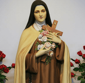 So, he took his 9-year-old son, and the two of them went to visit a shrine. At the shrine there were various statues of different saints. They stopped at each statue, said a prayer, and lit a candle. Then they came to a very unusual statue of St. Therese of Lisieux – the Little Flower. Unlike the other statues of plaster or marble, this statue was actually wearing clothes. She was wearing a real rosary, and his little boy played with the beads. Unlike other statues of St. Therese, which picture her holding roses, she held a bouquet in one hand and had the other hand stretched toward him with a single rose in it. He felt like she was offering this silver tipped rose to him, and he almost took it.