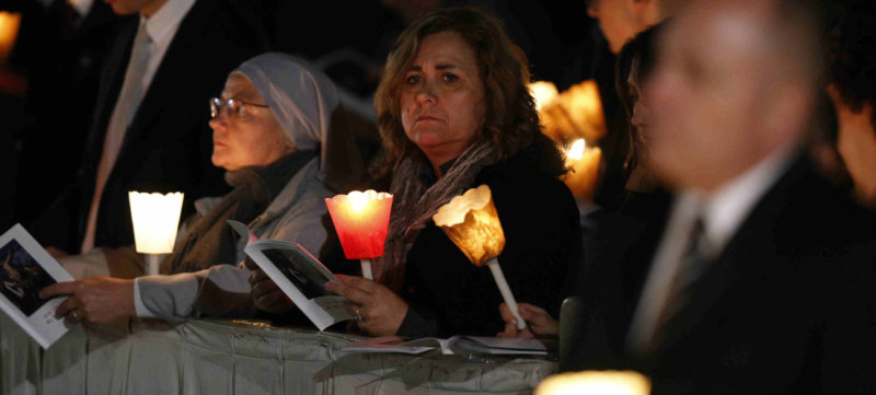 At each station, various people took turns carrying a large black cross and circling the famed Colosseum, which glowed a fiery orange from hundreds of candles placed around the ruins. Thousands of men, women and children standing outside also held lit candles as the sounds of prayers, reflections and music echoed throughout the hallowed site where many Christian executions took place in ancient Rome.