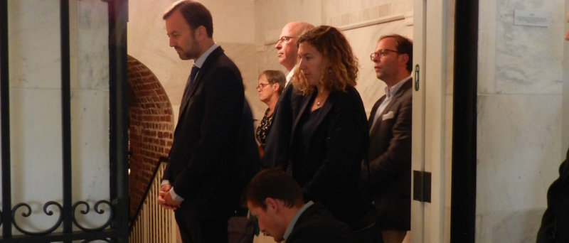 Mayor Francois Decoster wondered aloud if the symbol was a remembrance of John Carroll’s years at Saint-Omer, a town in the north of France, admitting it was speculation. “It sounds like well-founded speculation,” said his host, Archbishop Lori, who pointed out the same symbol on another Carroll engraving.