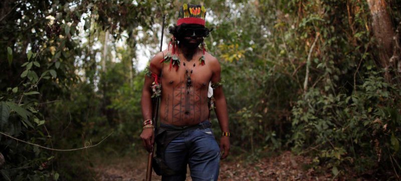 A Guajajara “forest guardian” paints his face while on Arariboia indigenous territory near Amarante, Brazil, Sept. 10, 2019. A report released Sept. 24 from the Brazilian bishops’ Indigenous Missionary Council shows the number of indigenous murdered last year increased by more than 20% in comparison to 2017. (CNS photo/Ricardo Moraes, Reuters)