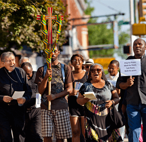 A group of about 50 Baltimore residents braved sweltering heat July 15 to walk through West Baltimore asking God to bring peace to the city.