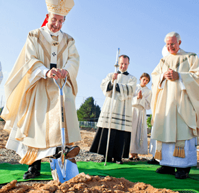 The crowd laughed and murmured agreement as he dug into the dirt for the ceremonial groundbreaking and blessing of St. Louis’ new parish activity center. Auxiliary Bishop Mitchell T. Rozanski and Monsignor Joseph L. Luca, St. Louis’ pastor, also turned the soil before joining parishioners at a reception celebrating the milestone.